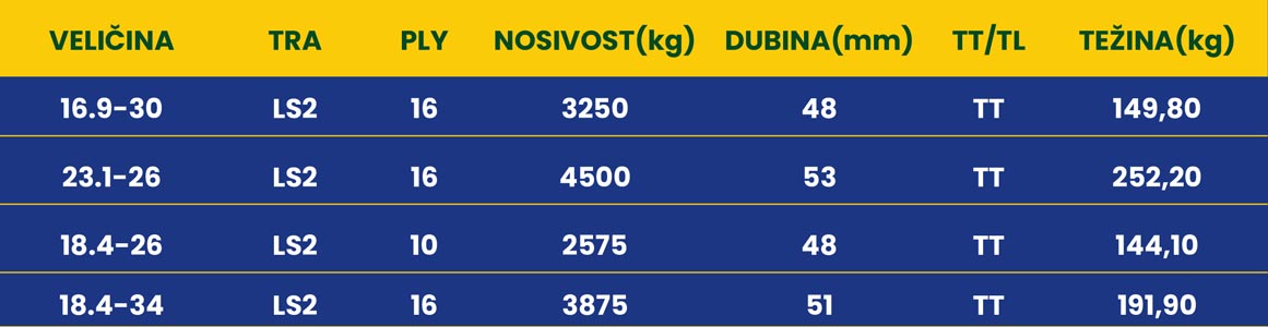 Advance LS-2 je robusna guma posebno dizajnirana za šumske traktore i drugu tešku mehanizaciju koja radi u ekstremnim šumskim uvjetima. Razvijena je za rad na teškim terenima, pružajući maksimalnu otpornost na rezanje i habanje uzrokovano oštrim panjevima i kamenjem. Konstrukcija s čeličnim pojasevima (Steel Belted) značajno povećava otpornost na proboje (puncture resistance) i štiti gazni sloj od kidanja (chunking). Dizajn gaznog sloja s velikim, otvorenim blokovima (lugovima) pod kutom od 23 stupnja osigurava izvrsnu vučnu snagu i vrhunsko samočišćenje od blata i ostataka drveta. Integrirani štitnik za naplatak (rim guard) i ojačana bočna stijenka sprječavaju ulazak krhotina između gume i naplatka te štite od bočnih udaraca.