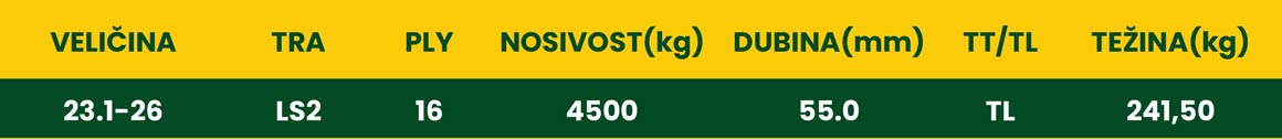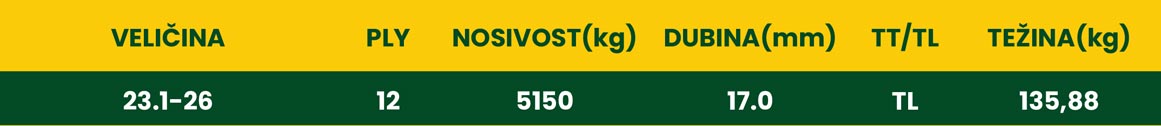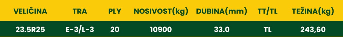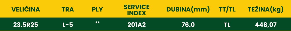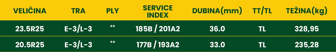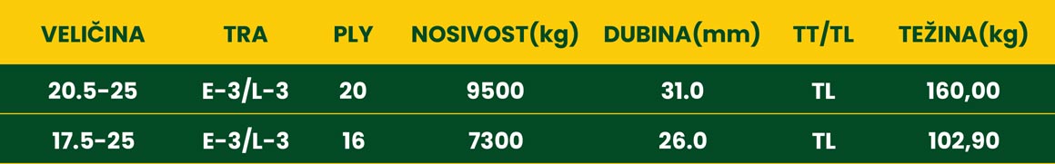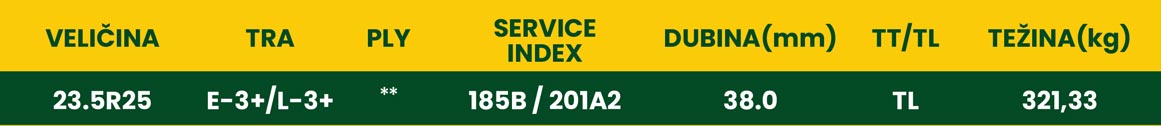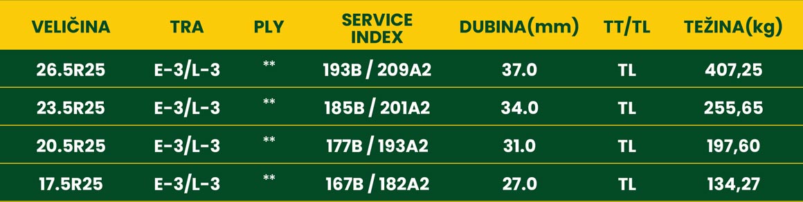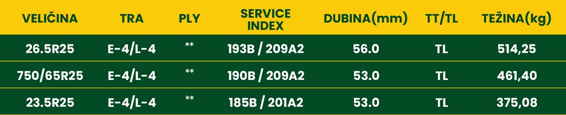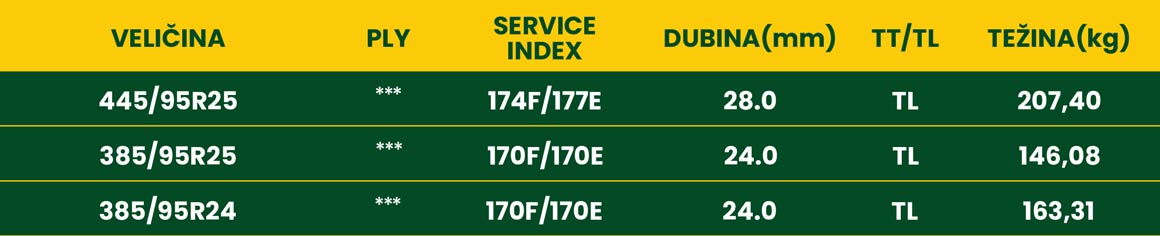 Dimenzije: 385/95R24 (14.00R24); 385/95R25 (14.00R25); 445/95R25 (16.00R25)